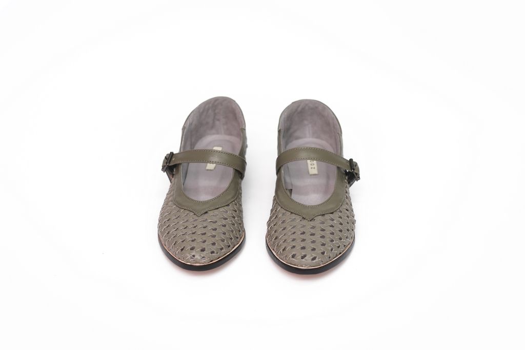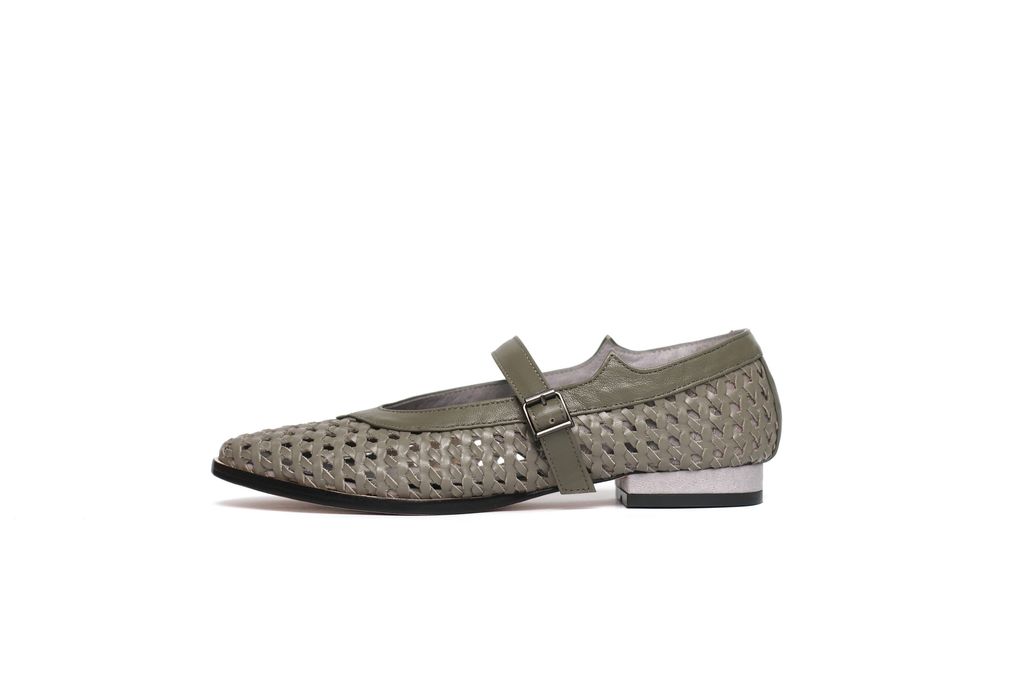 鞋面材質:灰色牛皮編織+灰綠色綿羊皮