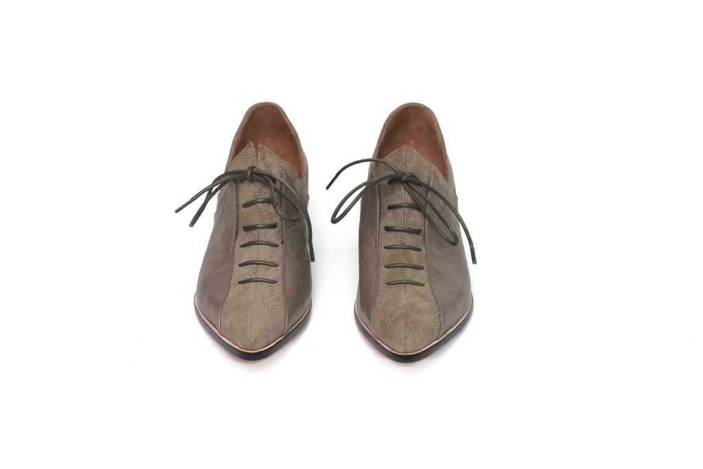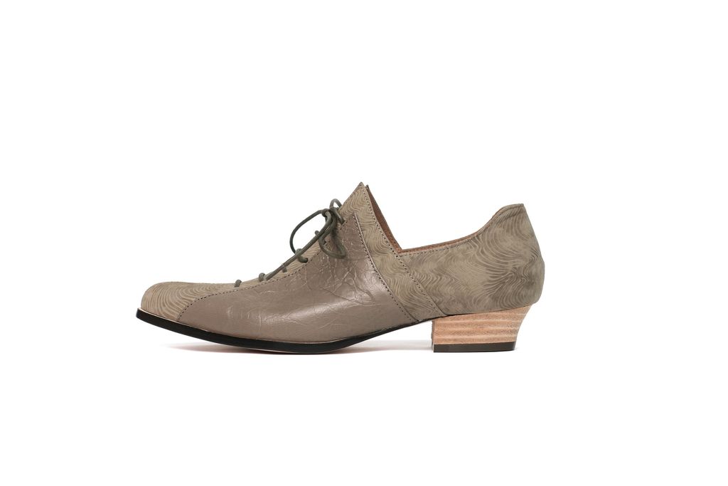 鞋面材質:卡其色皺紋油蠟羊皮+苔綠色螺旋紋胎牛皮