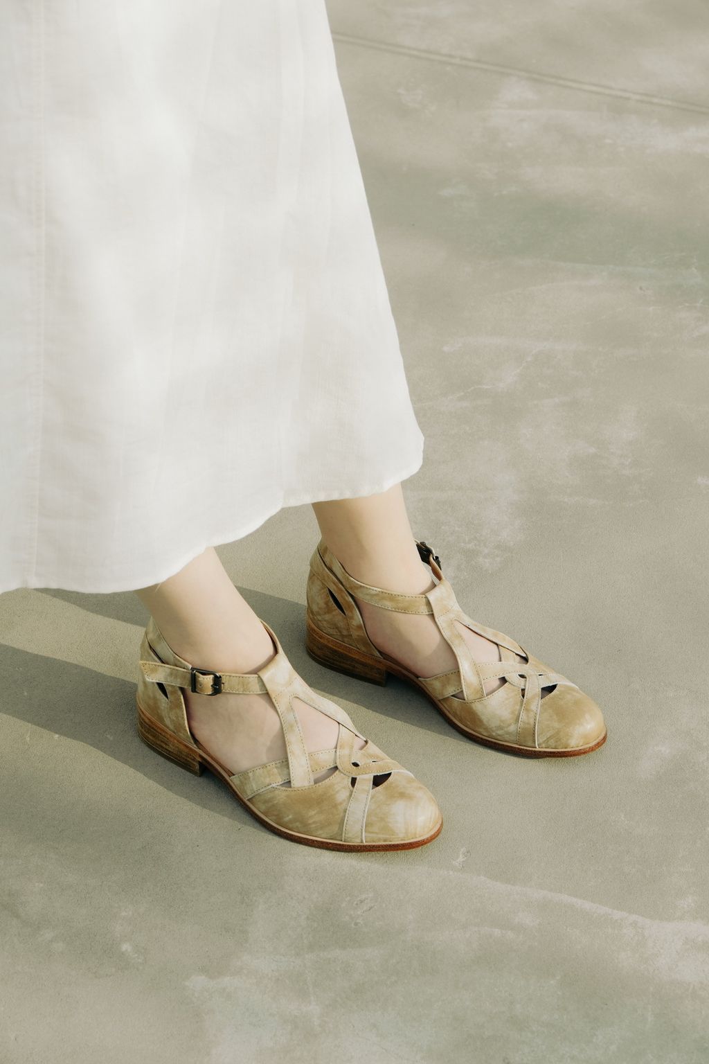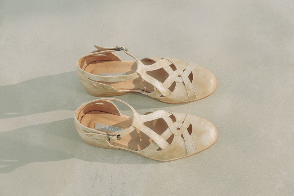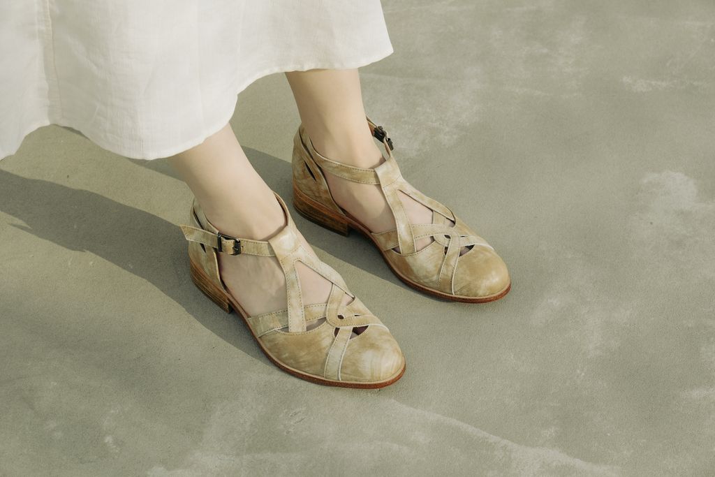 以此化為裁片線條,在層層的上與下的交疊,創作出一款中性中帶有甜美的個性風格涼鞋。